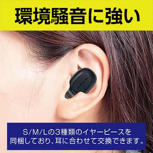●周囲の環境騒音に強いカナルタイプ。S/M/Lの3種類のイヤーピースを同梱しており、耳に合わせて交換できます。