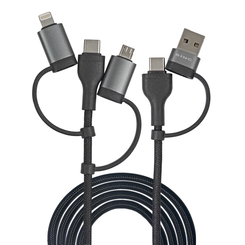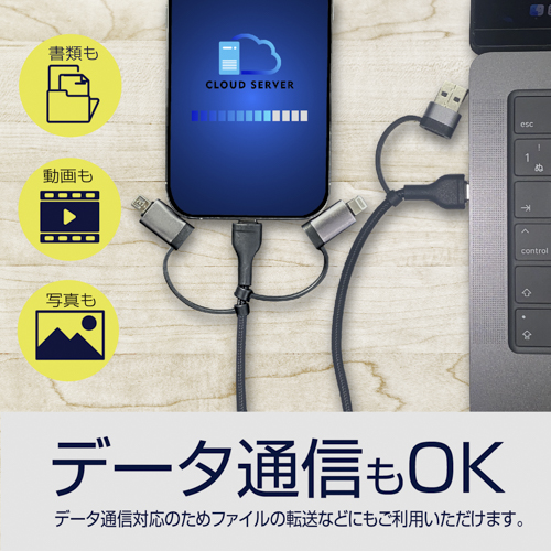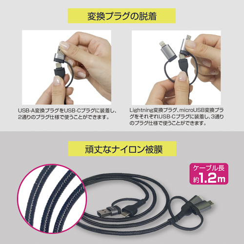 ●CtoCケーブルにUSB-A変換プラグとLightningおよびmicroUSB変換プラグが付いたケーブルです。