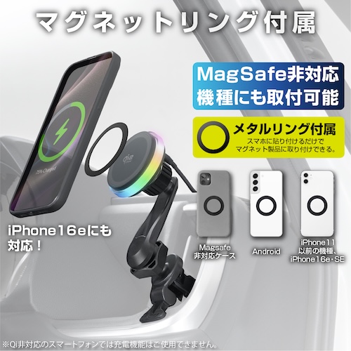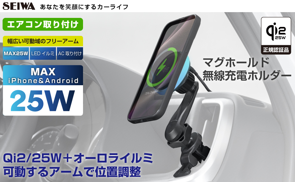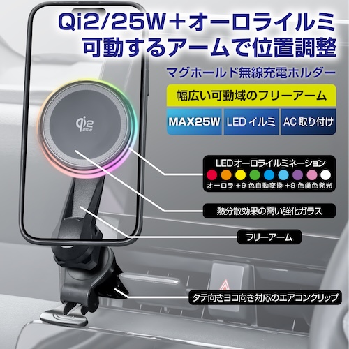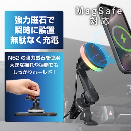●ネオジムマグネットでホールドしながらQi2.2(最大25W)で無線充電可能なスマートフォンホルダーです。