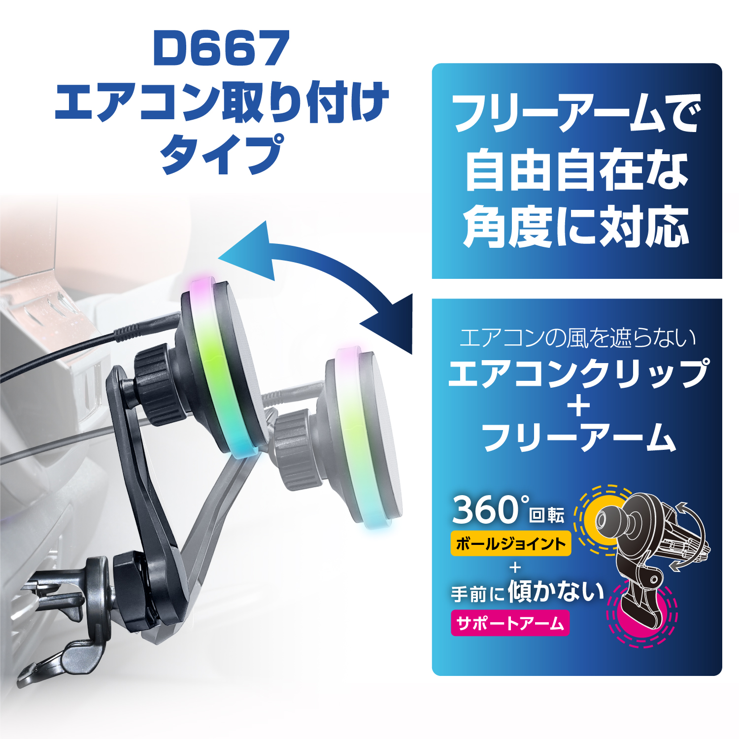 ●挟むだけで簡単に設置が可能なフリーアームつき汎用エアコンクリップタイプ。