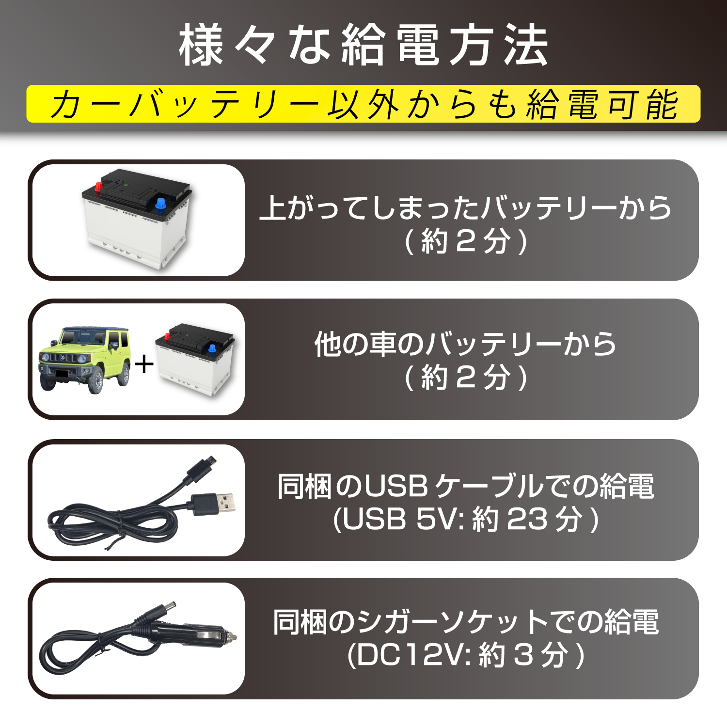 ●12V車のバッテリー、付属のマイクロUSBコード、DC12V充電器から充電できます。バッテリーが上がってしまった車両からも充電が可能です。(バッテリー電圧が5V未満の際は充電できません。)