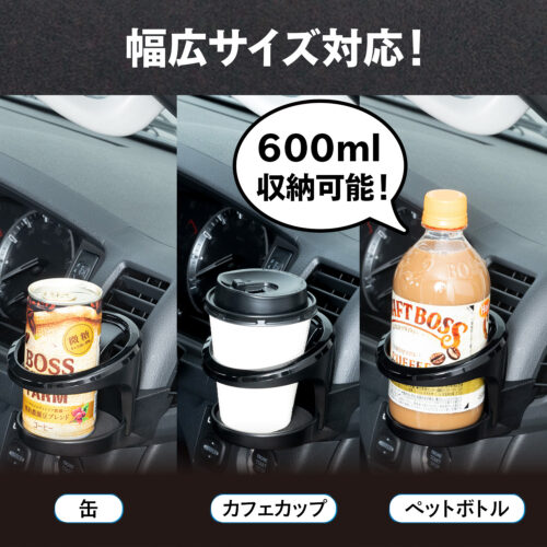 ●コンビニカフェカップから600mlペットボトル、ペットボトルコーヒー、太缶、細缶などを収納できます。