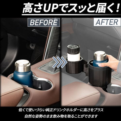 ●低くて使いづらい純正ドリンクホルダーに高さをプラスでき、自然な姿勢のまま飲み物を取ることができます。