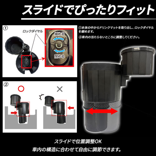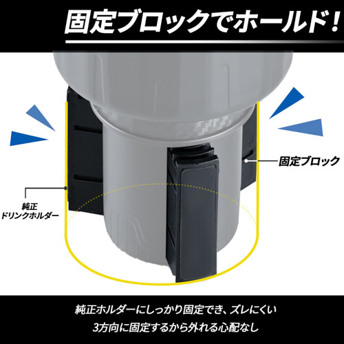 ●3カ所の固定ブロックで純正ドリンクホルダーにしっかり固定できます。
