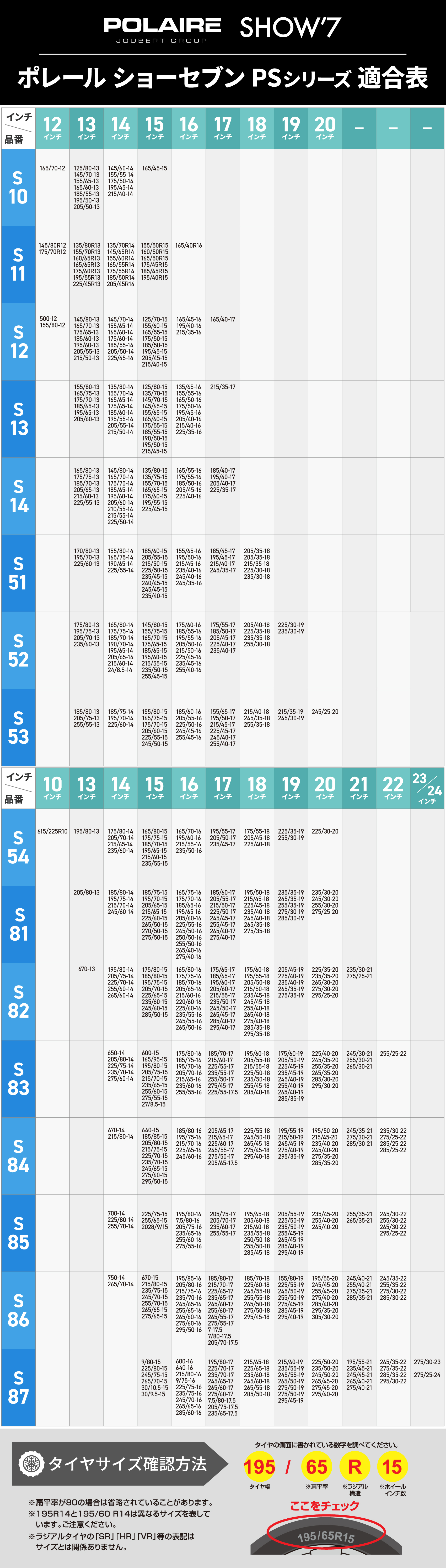 ●PS82(型番:S82)適合タイヤサイズ:670R13 195/80R14 205/75R14 225/70R14 255/60R14 265/60R14 175/80R15 185/80R15 195/75R15 205/70R15 225/65R15 235/60R15 245/60R15 285/50R15 165/80R16 175/75R16 185/70R16 205/65R16 215/60R16 220/60R16 225/60R16 235/55R16 245/55R16 265/50R16 175/65R17 185/65R17 195/60R17 205/60R17 215/55R17 235/50R17 245/50R17 265/45R17 285/40R17 295/40R17 175/60R18 195/55R18 205/50R18 215/50R18 235/45R18 245/45R18 255/40R18 265/40R18 275/40R18 285/35R18 295/35R18 205/45R19 225/40R19 235/40R19 265/35R19 275/35R19 225/35R20 235/35R20 265/30R20 275/30R20 295/25R20 235/30R21 275/25R21