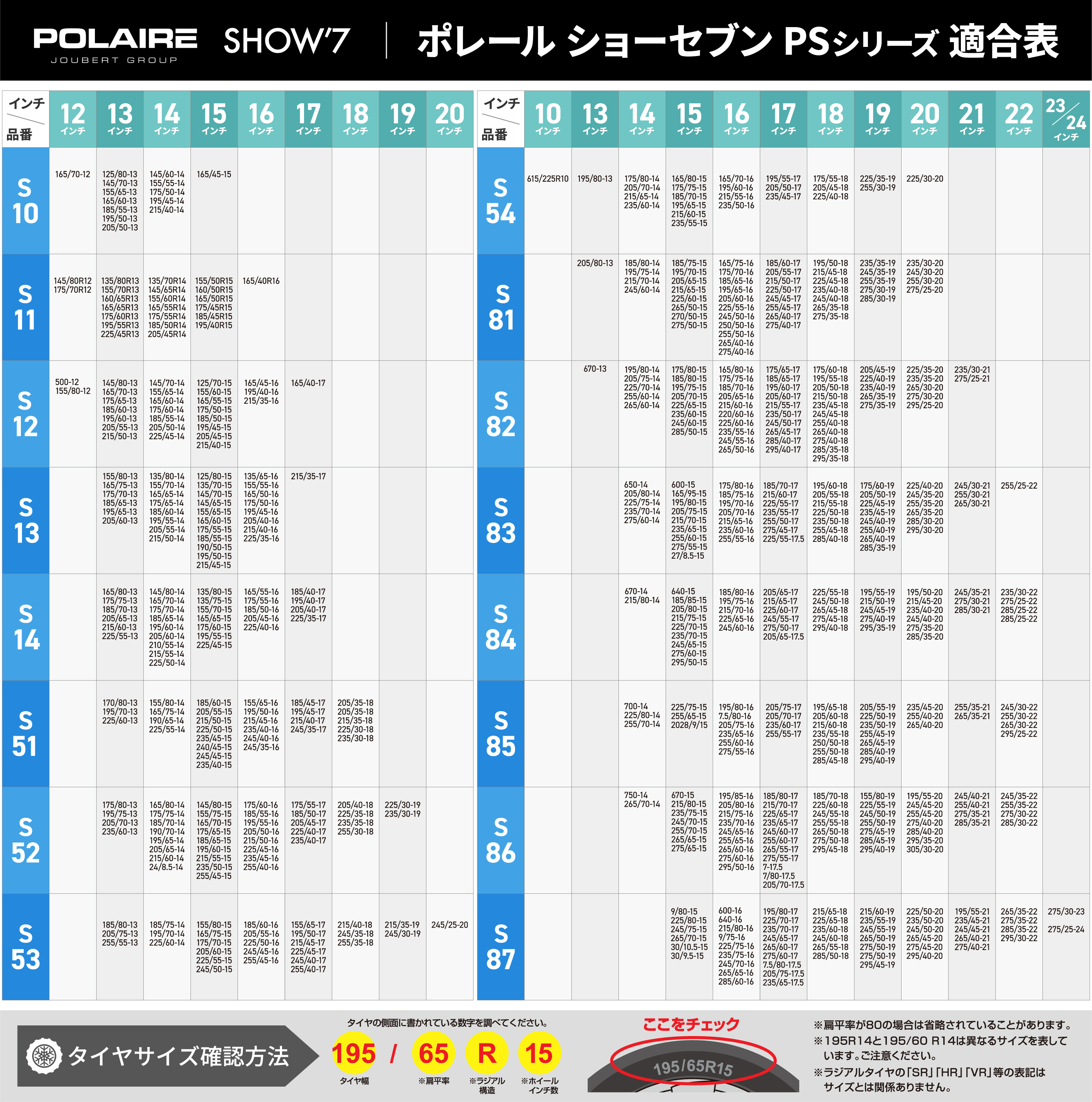 ●PS82(型番:S82)適合タイヤサイズ:670R13 195/80R14 205/75R14 225/70R14 255/60R14 265/60R14 175/80R15 185/80R15 195/75R15 205/70R15 225/65R15 235/60R15 245/60R15 285/50R15 165/80R16 175/75R16 185/70R16 205/65R16 215/60R16 220/60R16 225/60R16 235/55R16 245/55R16 265/50R16 175/65R17 185/65R17 195/60R17 205/60R17 215/55R17 235/50R17 245/50R17 265/45R17 285/40R17 295/40R17 175/60R18 195/55R18 205/50R18 215/50R18 235/45R18 245/45R18 255/40R18 265/40R18 275/40R18 285/35R18 295/35R18 205/45R19 225/40R19 235/40R19 265/35R19 275/35R19 225/35R20 235/35R20 265/30R20 275/30R20 295/25R20 235/30R21 275/25R21
