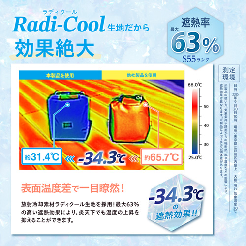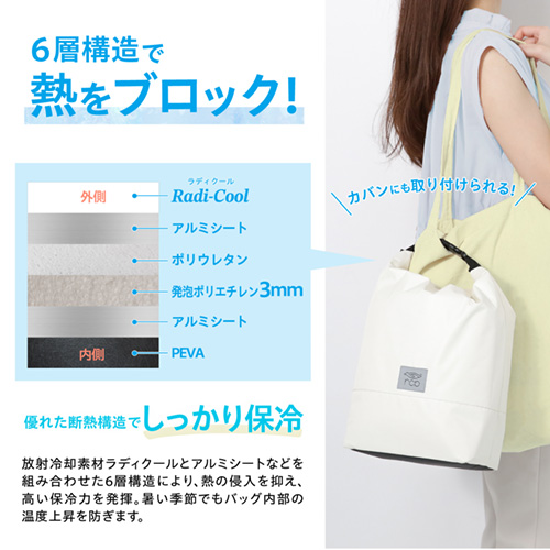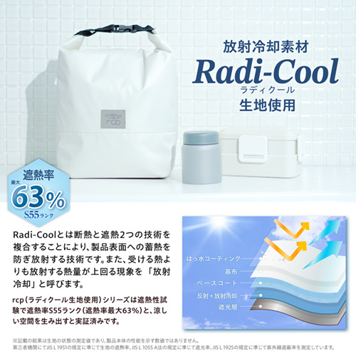 ●温度上昇を抑える放射冷却素材「ラディクール」を表面生地に採用した保冷バッグです。