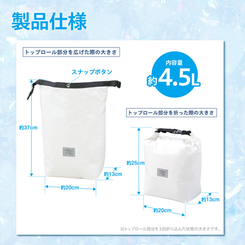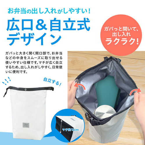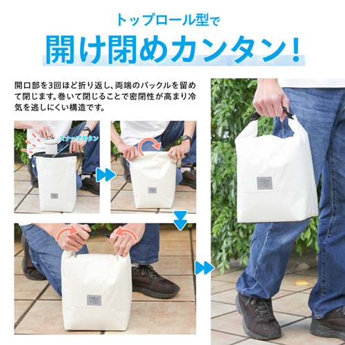 ●開口部はトップロール仕様を採用。くるっと巻いてバックルで留めることで内部をしっかり密閉でき、保冷効果を高めます。