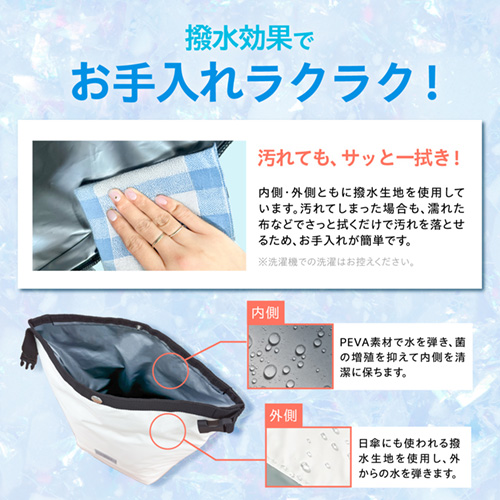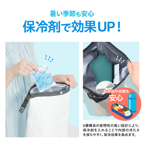 ●表地にラディクールを使用することで外気温の影響を受けにくく、さらに芯材にはアルミシート・ポリウレタン・発泡ポリエチレンを組み合わせ、優れた保冷性能を実現しています。
