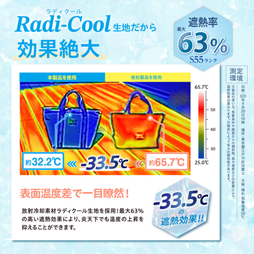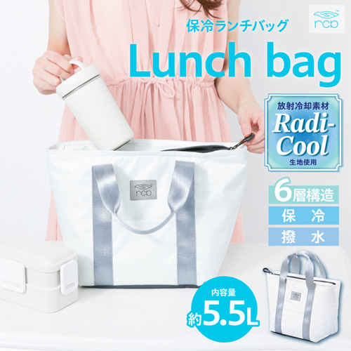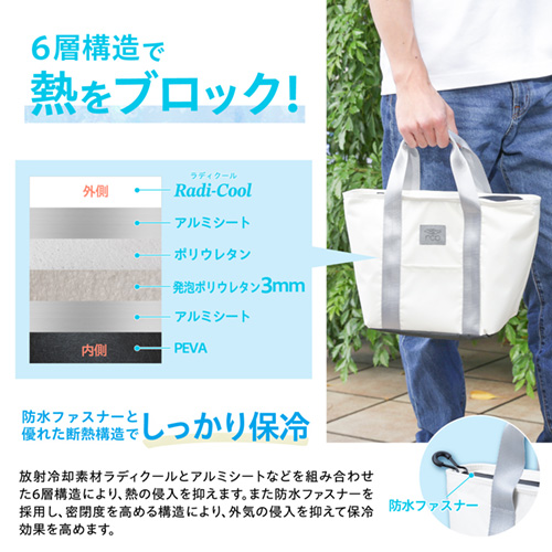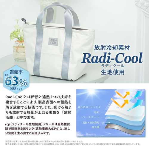 ●温度上昇を抑える放射冷却素材「ラディクール」を表面生地に採用した保冷ランチバッグです。