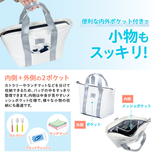 ●外側と内側の両方にポケットを備えているため、保冷剤やカトラリー、小物類もすっきり収納できます。