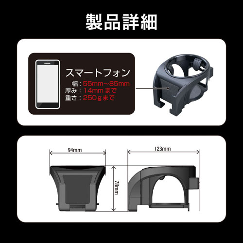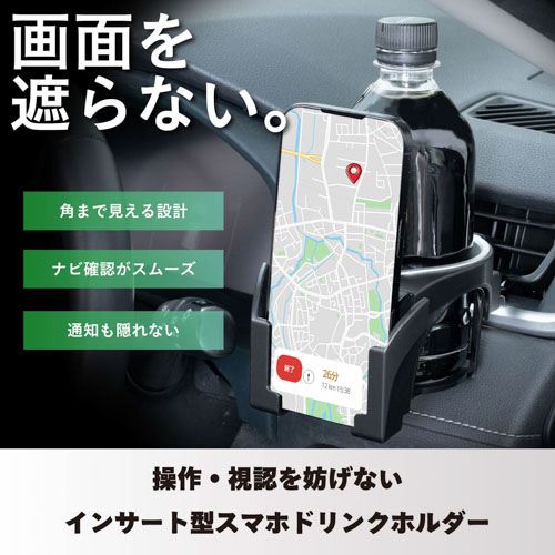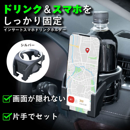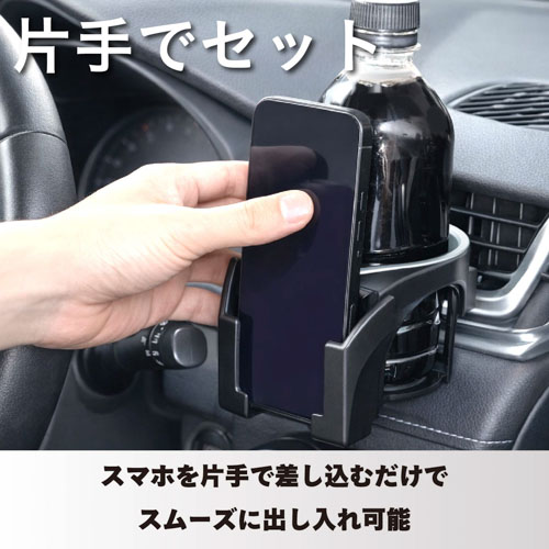 ●上から片手で差し込むだけで左右にアームが連動して開き、簡単にスマホを固定できます。
