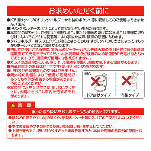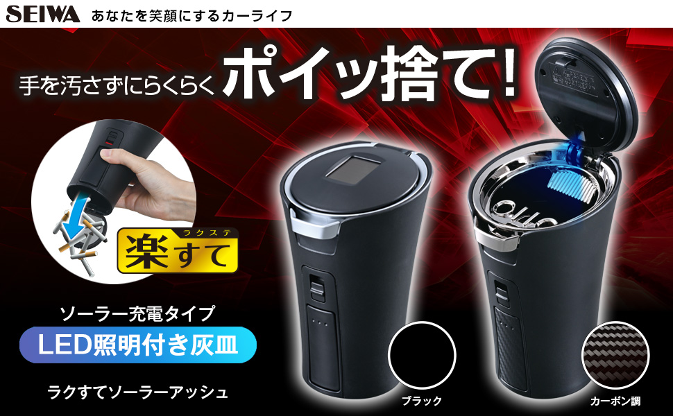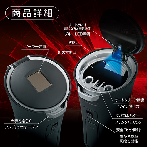●暗くなると点灯、明るくなると消灯するオートライト機能のブルーLED照明がついたソーラータイプの灰皿です。