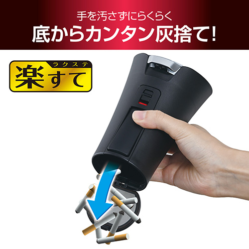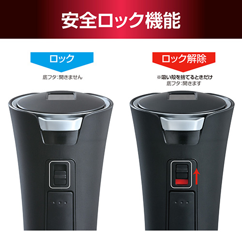 ●安全ロックを解除すると底フタがワンプッシュで開き、吸い殻を簡単に捨てられます。