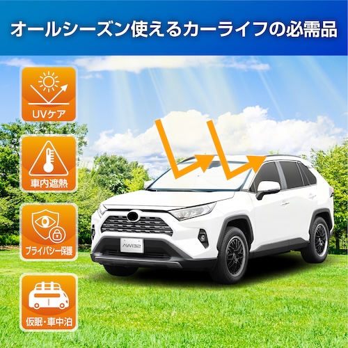 ●遮熱効果は60%以上で車内温度の上昇を抑えることができます。●便利な収納袋付きで、収納時はドアポケットなどに収納できます。